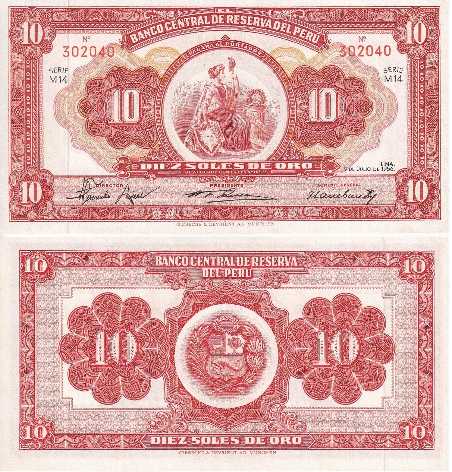 Peru 10 Soles De Oro 1956 P 77 AUnc