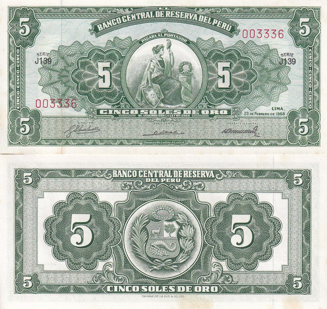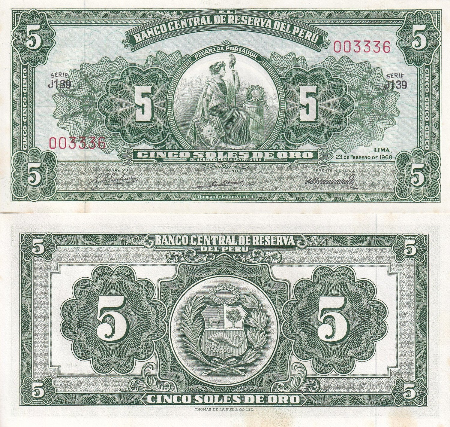 Peru 5 Soles De Oro 1968 P 83 UNC Yellow Tone