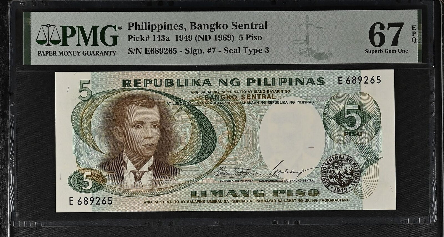 Philippines 5 Piso 1949 ND 1969 P 143 a Superb Gem UNC PMG 67 EPQ TOP POP