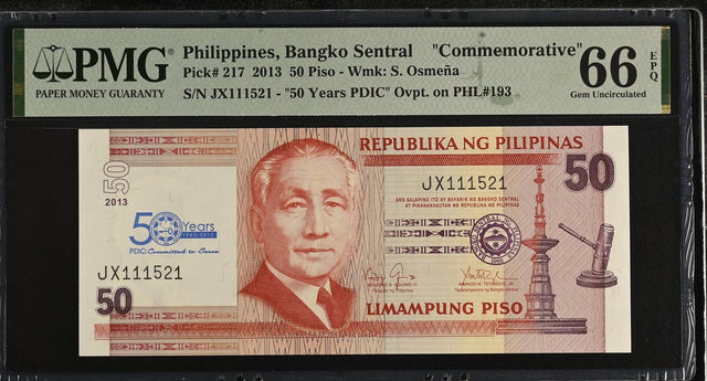 Philippines 50 Piso 2013 P 217 Commemorative 50TH Gem UNC PMG 66 EPQ
