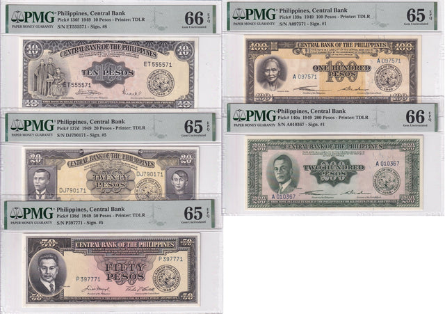 Philippines Set 5; 5 10 20 50 100 200 Pesos 1949 P 136-140 Gem UNC PMG 65 66 EPQ