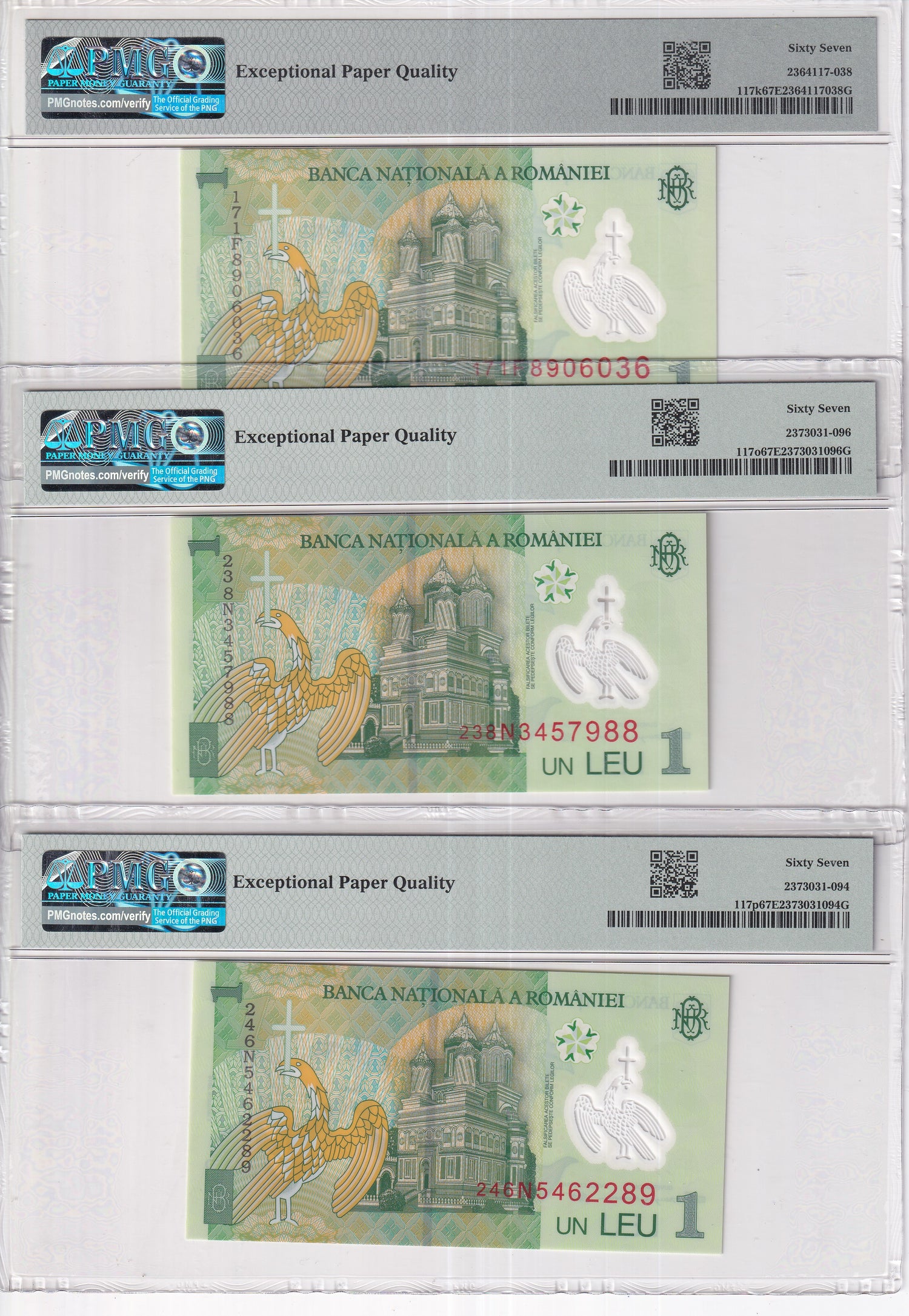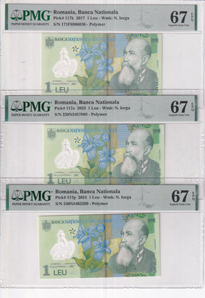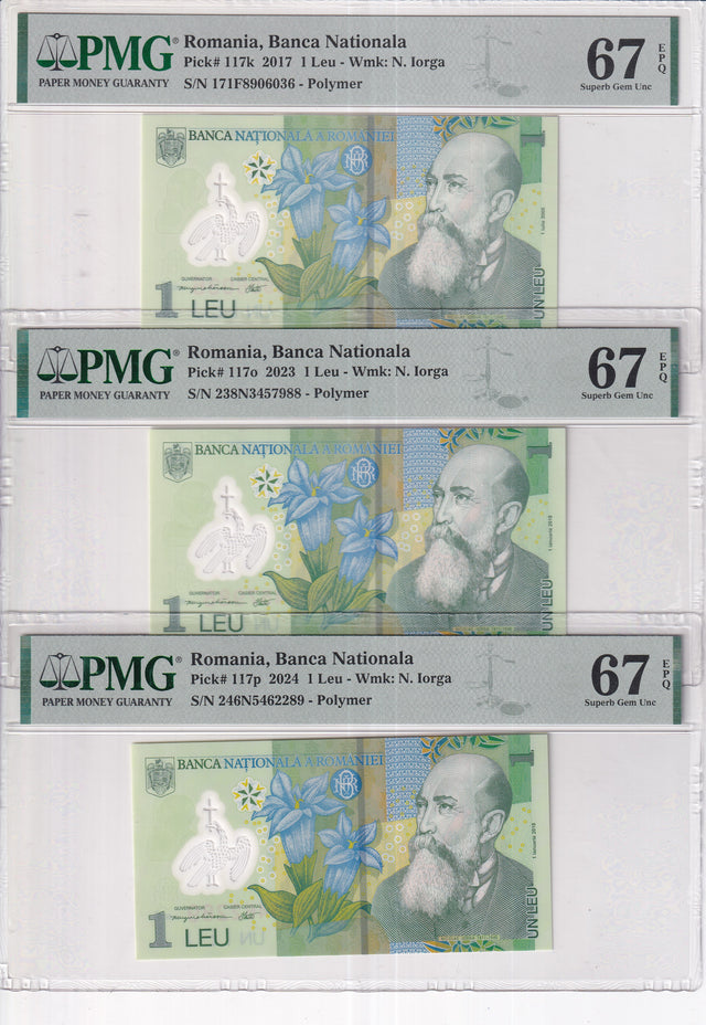 Romania Set 3; 1 Leu 2017 2023 2024 P 117 Superb Gem UNC PMG 67 EPQ