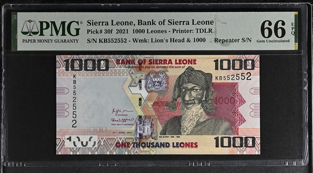 Sierra Leone 1000 Leones 2021 P 30 f Repeater 552-552 Gem UNC PMG 66 EPQ Top Pop is backordered and will ship as soon as it is back in stock.