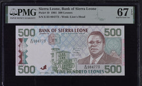 Sierra Leone 500 Leones 1991 P 19 a Superb Gem UNC PMG 67 EPQ