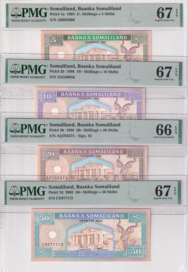 Somaliland set 4, 5 10 20 50 Shil 1994 P 1 2 3 7 Superb Gem UNC PMG 66 67 EPQ