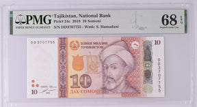 Tajikistan 10 Somoni 2018 P 24 c Superb Gem UNC PMG 68 EPQ