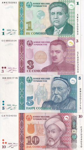 Tajikistan Set 4 Pcs 1 3 5 10 Somoni Random Year P 14A P 15 P 20 P 24 UNC