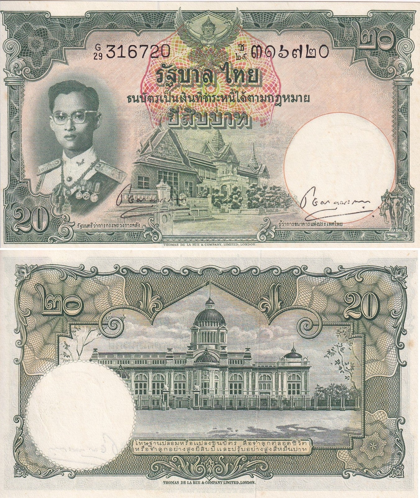 Thailand 20 Baht ND 1953 P 77 Sign 39 Choat AU-UNC