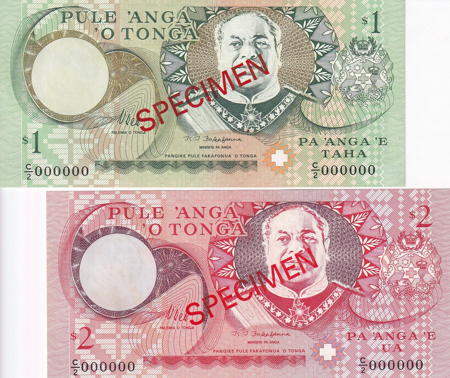 Tonga Set 2 UNC 1 2 Pa'anga ND 1995 P 31 P 32 SPECIMEN UNC