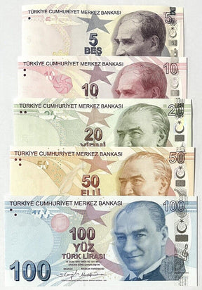 Turkey Set 5 Pcs 5 10 20 50 100 Lira 2009 - 2020 P 222 - 226 Random Sign UNC