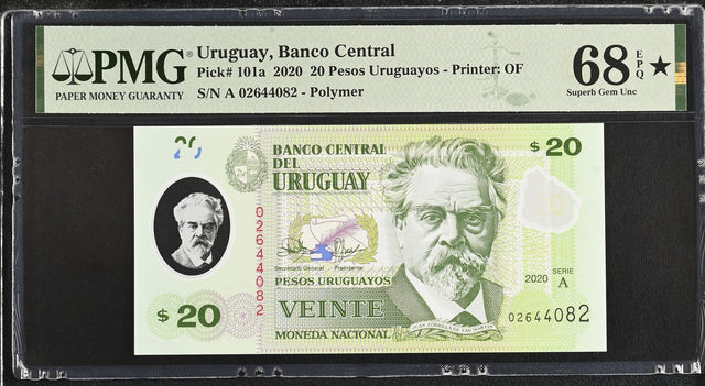 Uruguay 20 Pesos 2020 P 101 a Superb Gem UNC PMG 68 EPQ Extra Star