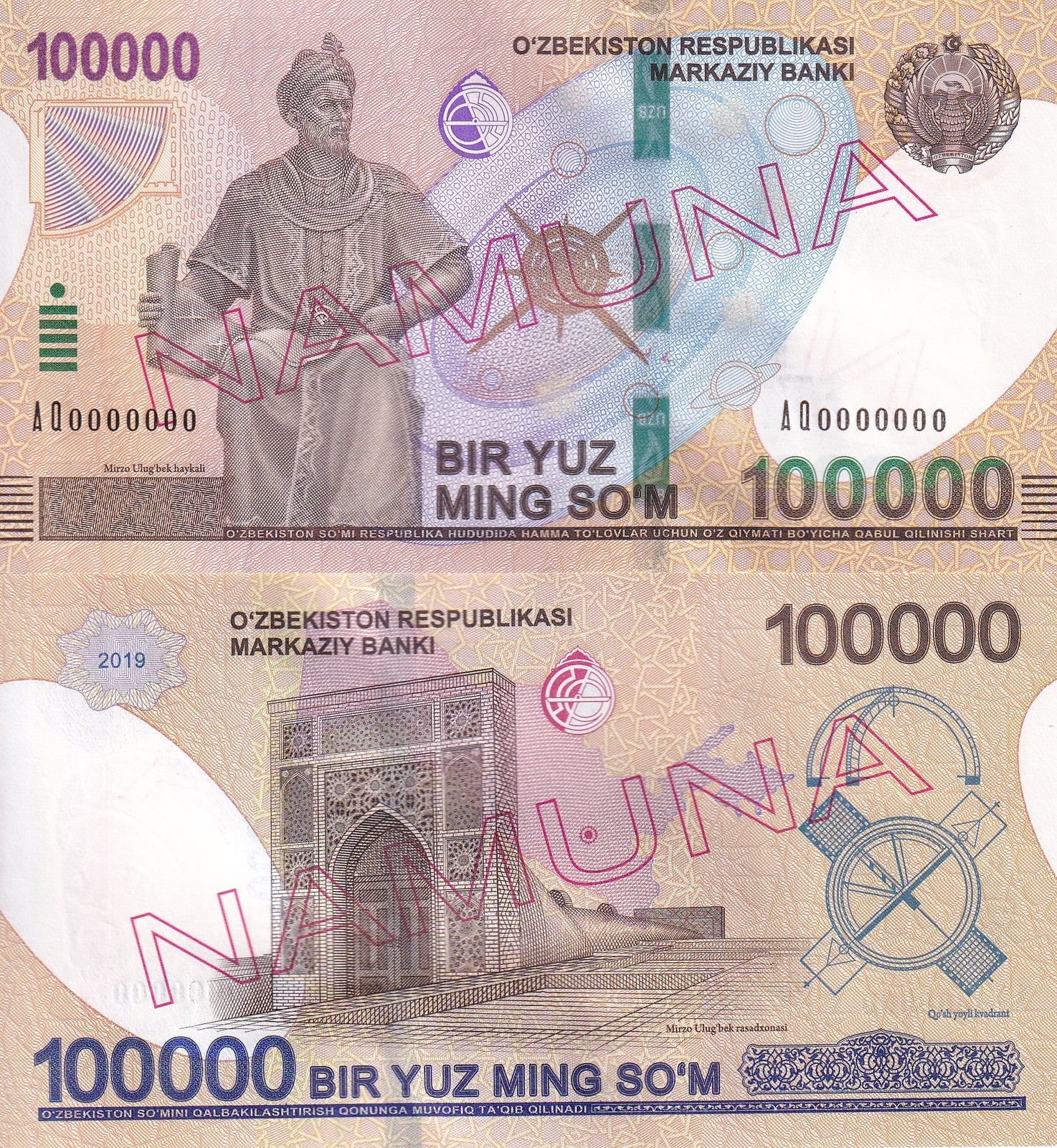 Uzbekistan 100000 Som 2019 SPECIMEN AQ 0000000 P 86 AUnc