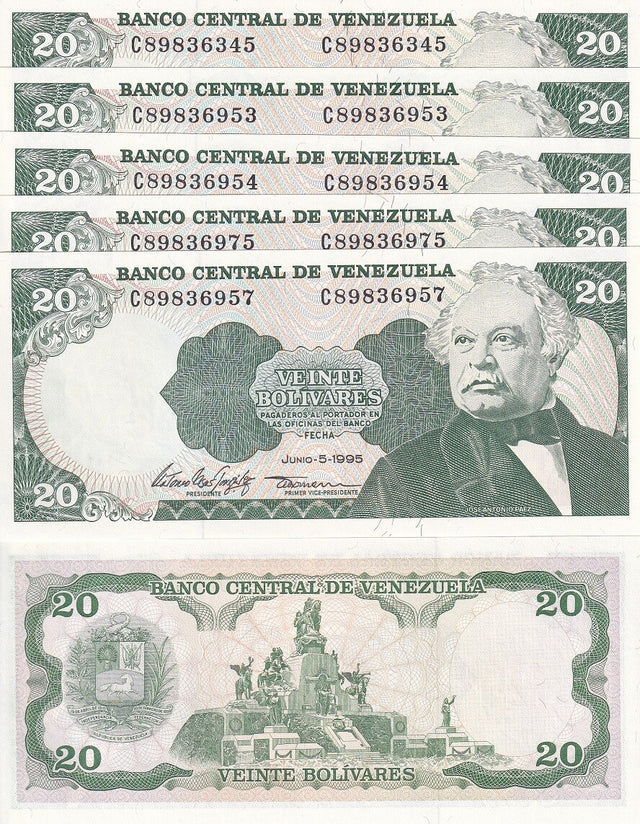 Venezuela 20 Bolivares 1995 P 63 e AUnc LOT 5 PCS