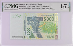 West African States Togo 5000 Francs 2016 P 817Tp Superb Gem UNC PMG 67 EPQ