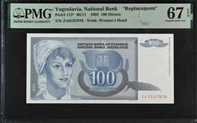 Yugoslavia 100 Dinara 1992 P 112* REPLACEMENT Superb Gem UNC PMG 67 EPQ