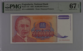 Yugoslavia 50000000 Dinara 1993 P 133 Superb GEM UNC PMG 67 EPQ