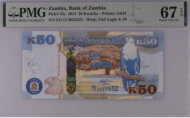 Zambia 50 Kwacha 2014 P 53 c Superb Gem UNC PMG 67 EPQ