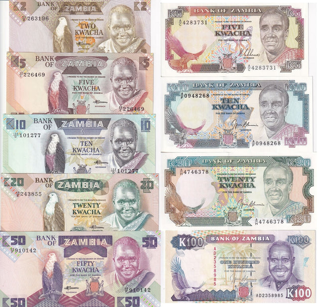 Zambia Set 9 PCS 2 5 10 20 50 100 Kwacha ND 1980-1991 P 24 25 26 27 28-34 UNC