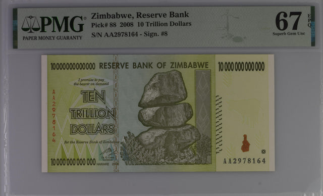 Zimbabwe 10 Trillion Dollars 2008 P 88 Superb Gem UNC PMG 67 EPQ