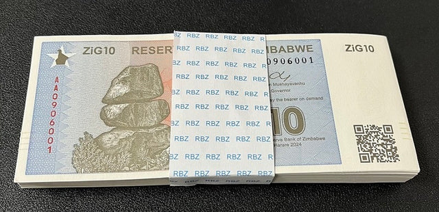 Zimbabwe 10 ZiG 2024 P NEW GOLD Reserve Backed with QR Code Lot 100 UNC 1 BUNDLE