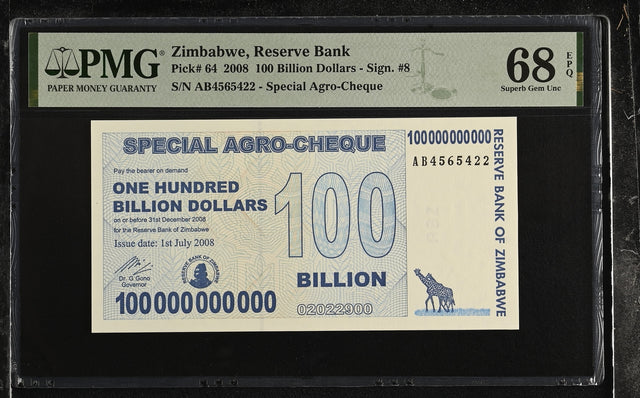 Zimbabwe 100 Billion Dollars 2008 P 64 Superb Gem UNC PMG 68 EPQ TOP POP