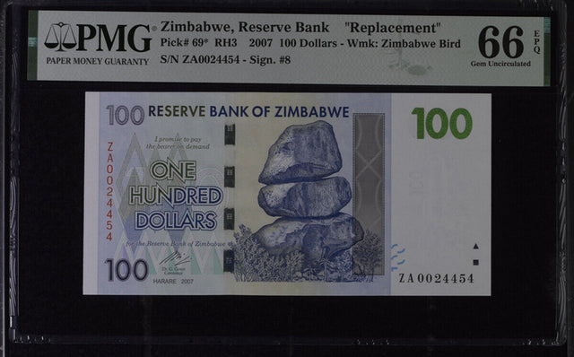 Zimbabwe 100 Dollars 2007 P 69* ZA Replacement Gem UNC PMG 66 EPQ