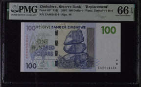 Zimbabwe 100 Dollars 2007 P 69* ZA Replacement Gem UNC PMG 66 EPQ is backordered and will ship as soon as it is back in stock.
