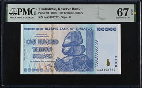 Zimbabwe 100 Trillion Dollars 2008 P 91 Superb Gem UNC PMG 67 EPQ Misaligned Digit ERROR is backordered and will ship as soon as it is back in stock.