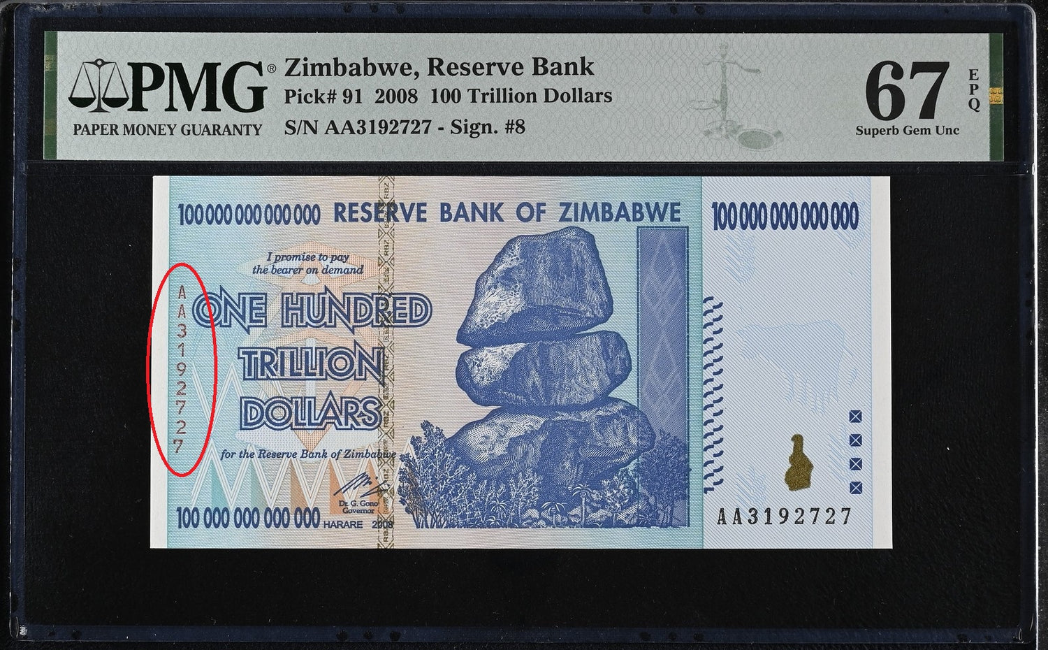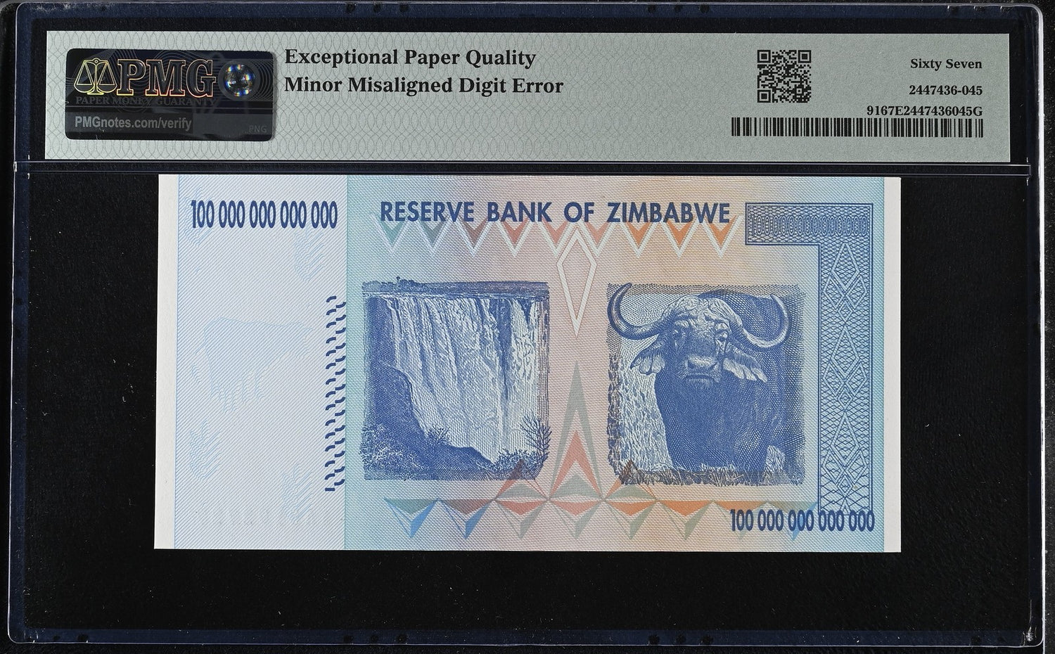 Zimbabwe 100 Trillion Dollars 2008 P 91 Superb Gem UNC PMG 67 EPQ Misaligned ERROR