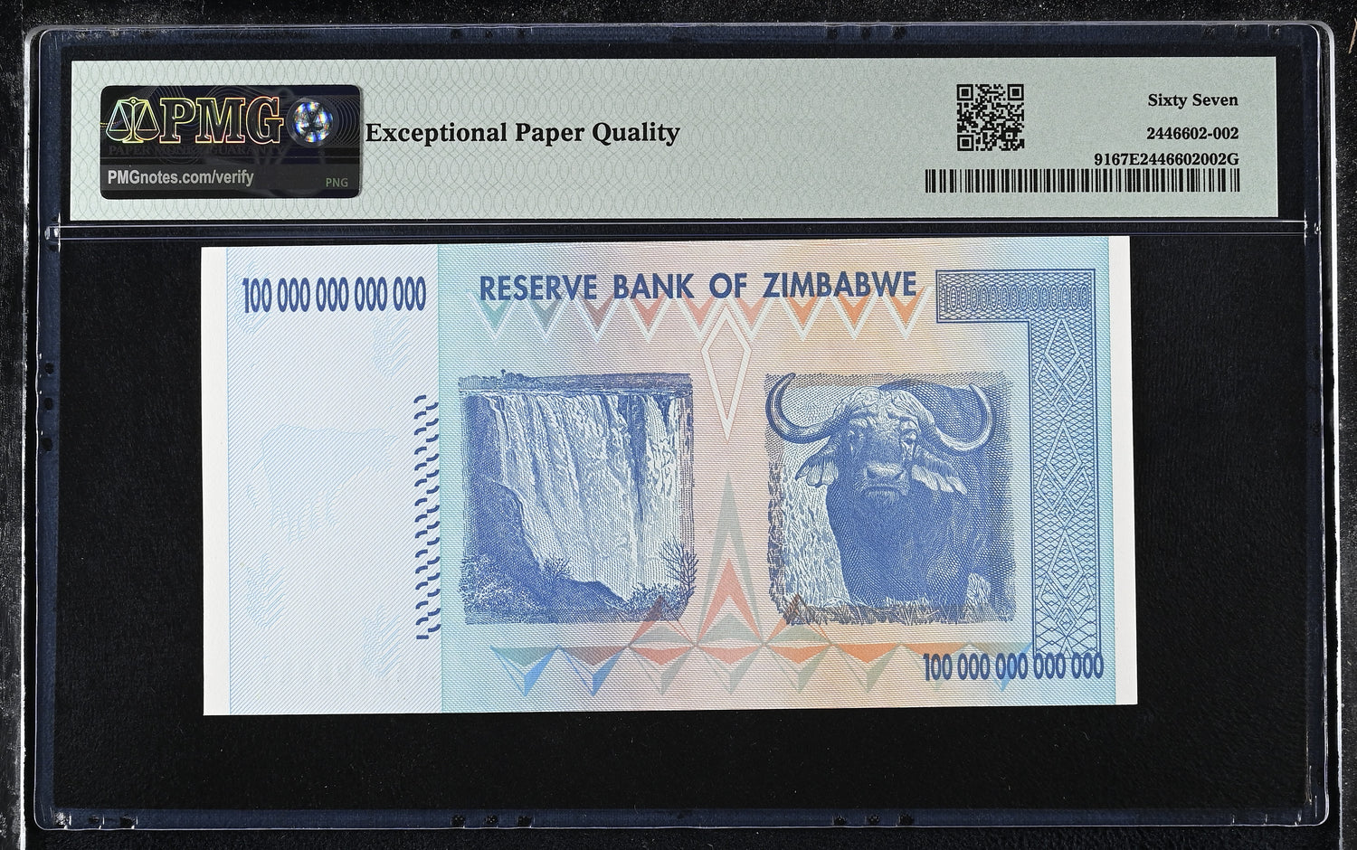 Zimbabwe 100 Trillion Dollars 2008 P 91 Superb Gem UNC PMG 67 EPQ Misaligned ERR
