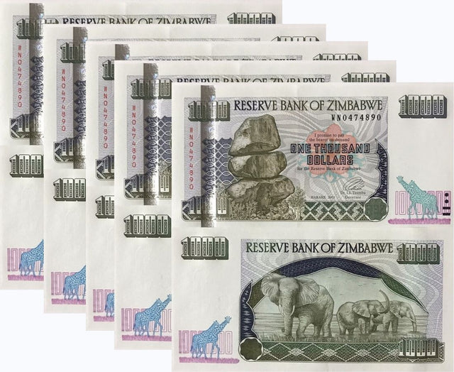 Zimbabwe 1000 Dollars 2003 P 12 b Small Digits UNC LOT 5 PCS