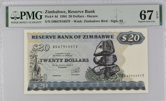 Zimbabwe 20 Dollars 1994 P 4 d Superb Gem UNC PMG 67 EPQ
