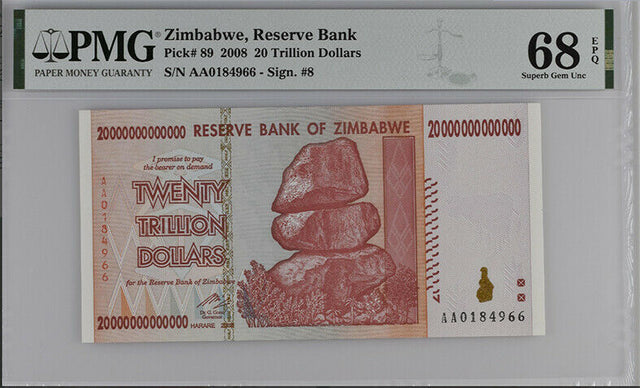 Zimbabwe 20 Trillion Dollars 2008 P 89 Superb GEM UNC PMG 68 EPQ