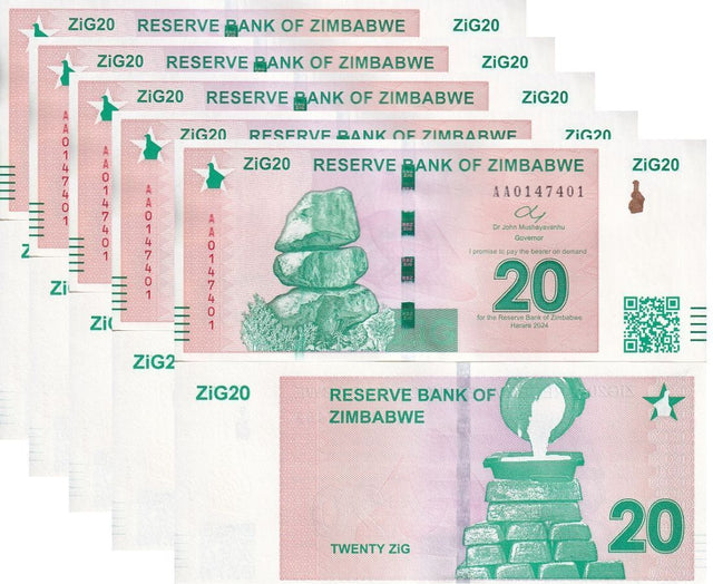 Zimbabwe 20 ZiG 2024 P NEW Design Gold Reserve Backed With QR Code LOT 5 UNC