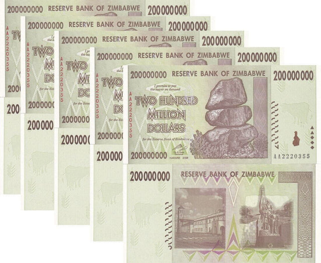 Zimbabwe 200 Million Dollars 2008 P 81 UNC LOT 5 PCS