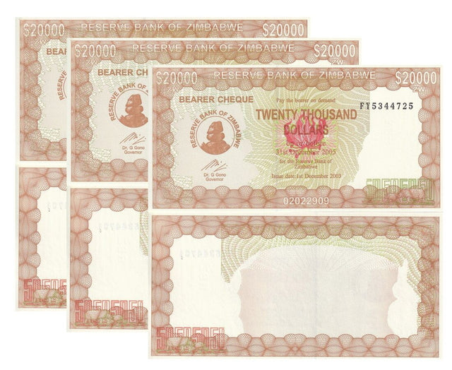 Zimbabwe 20000 Dollars 2003/2005 P 23 AUnc LOT 3 PCS