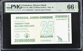 Zimbabwe 25 Billion Dollars 2008 P 62 Gem UNC PMG 66 EPQ is backordered and will ship as soon as it is back in stock.
