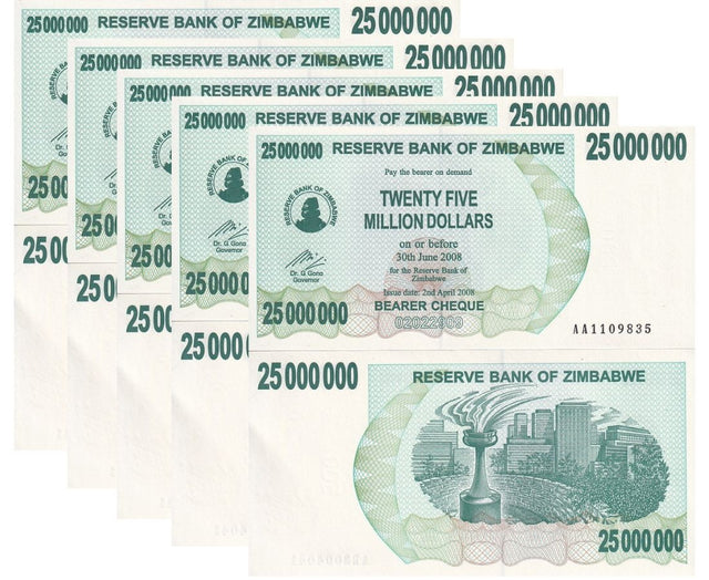 Zimbabwe 25 Million Dollars 2008 P 56 UNC LOT 5 PCS