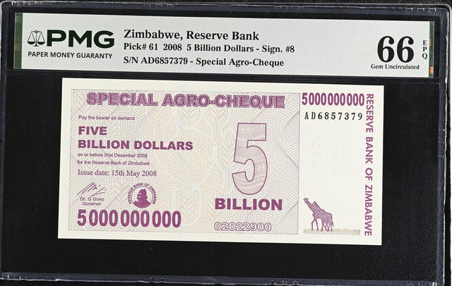 Zimbabwe 5 Billion Dollars 2008 P 61 Gem UNC PMG 66 EPQ