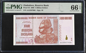 Zimbabwe 5 Billion Dollars 2008 P 84 Gem UNC PMG 66 EPQ is backordered and will ship as soon as it is back in stock.