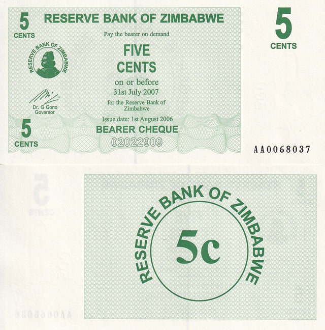 ZIMBABWE 5 CENTS 2006 BEARER CHEQUE P 34 UNC