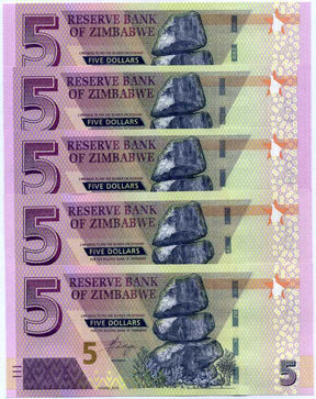 Zimbabwe 5 Dollars 2019 P 102 UNC LOT 5 PCS is backordered and will ship as soon as it is back in stock.