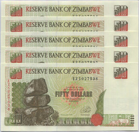Zimbabwe 50 Dollars 1994 P 8 UNC Lot 5 PCS is backordered and will ship as soon as it is back in stock.