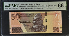 Zimbabwe 50 Dollars 2020 P 105 a Gem UNC PMG 66 EPQ is backordered and will ship as soon as it is back in stock.