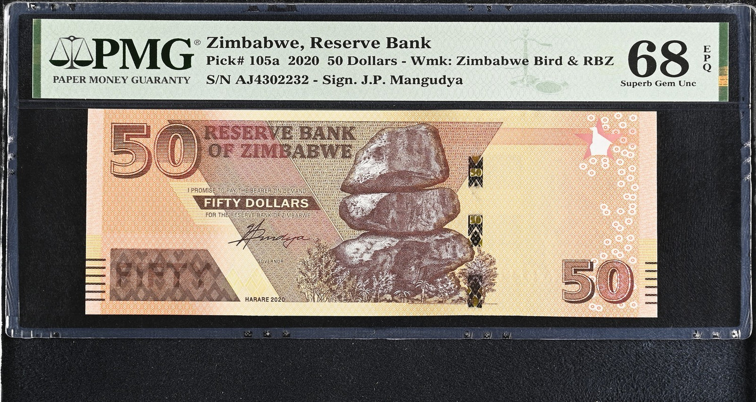 Zimbabwe 50 Dollars 2020 P 105 a Superb Gem UNC PMG 68 EPQ TOP POP