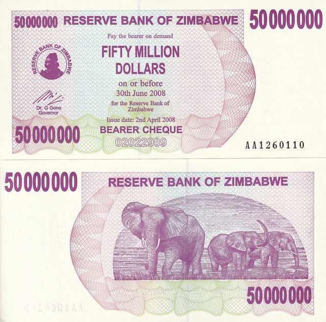 Zimbabwe 50 Million 50000000 Dollars 2008 P 57 UNC