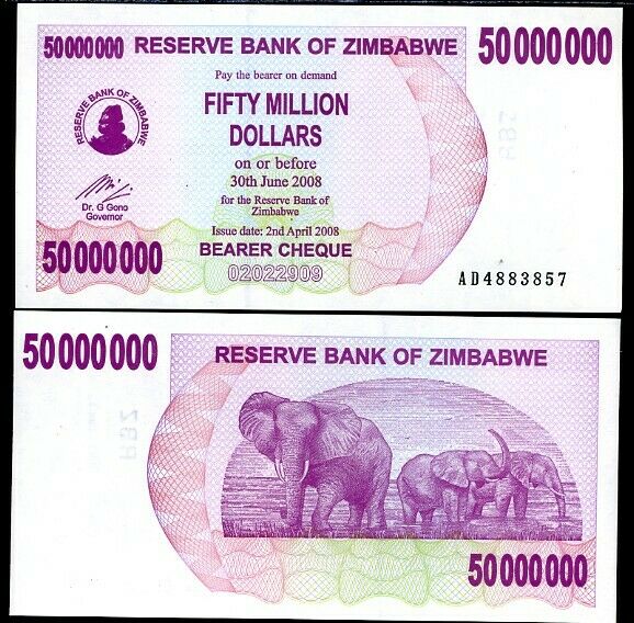 ZIMBABWE 50 MILLION DOLLARS BEARER CHEQUE 2008 P 57 UNC