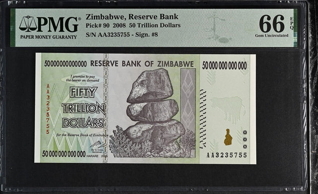 Zimbabwe 50 Trillion Dollars 2008 P 90 Gem UNC PMG 66 EPQ