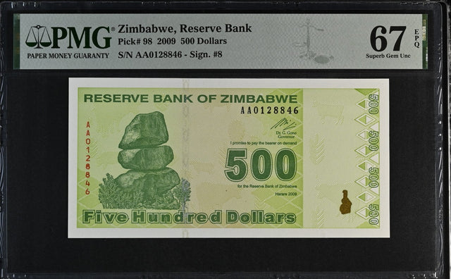 Zimbabwe 500 Dollars 2009 P 98 Superb Gem UNC PMG 67 EPQ