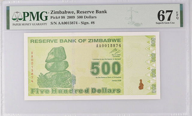 Zimbabwe 500 Dollars 2009 P 98 Superb Gem UNC PMG 67 EPQ